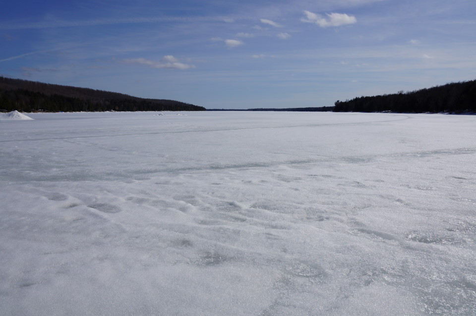 | Lake Lucerne has entered that strange time of year where the ice covering the lake is itself covered with water flowing in (from both rain and melting snow). Unforunately the frost is mostly out of the ground. Streams of snow melt that had been hoped would flow in to the lake are instead soaking in to the ground. Looks like, barring a really big storm, we can't count on the watershed to bring the lake back up. With all that water in the ground, maybe the springs will be up to the task. All we need is about 48 inches to bring it back to normal. The lake ice is estimated to be over 20 inches thick. We spent all our ice hole drilling time collecting sap and firing cookers. We'll get a hole in the ice to measure as soon as the sun comes out. I'm thinking Friday. The NCC is still closed/covered with snow. -Nemo called for a tee time, the phone just rang. Previous Next |