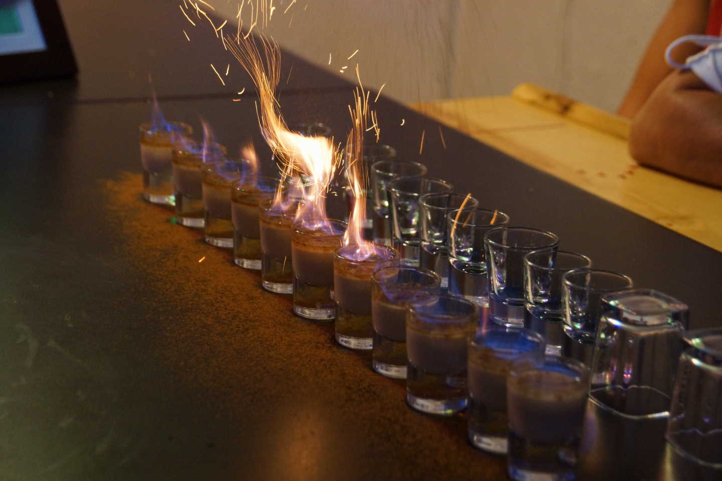 | By 10:00 PM there were 13 well carved orange balls glowing on the bar's deck. All were skillfully sculpted and stayed lit until after midnight. | The post carving celebration included food, a record 12 Bailey's comets and an interesting adult beverage flown in all the way from Italy. | |||||||||||||||||||||||||||