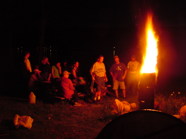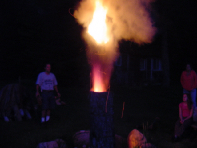 | On Sunday night we had a "Dragon Fire". A hollow log was placed on end and filled with birch bark. An oxygen starved fire is lit at the bottom. The hot uncombusted gases pouring out of the top eventually ignite and form a fireball. |
