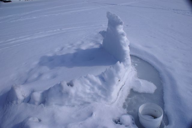 | On Sunday morning, it was time for the lake to get a new hole to check the ice thickness. |