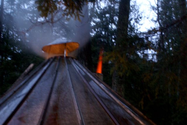 | On Saturday night, we worked on our layering. I regret that earlier in the evening no pictures were taken of the group of delinquents that lit the stump in front of the bar. Because of the wet weather, some accelerant was splashed on it. No one in the group of bevises wanted to risk the loss of eyebrows by lighting it close up, so they retreated about 150 feet and fired bottle rockets at it. It did not look like it would work until the 6th volley. The fireball amused all. | ||||||||||||||||||||||||||||||||||||||||||||||||||||||