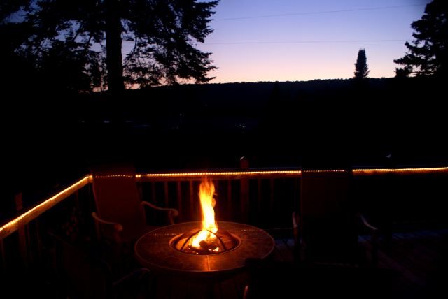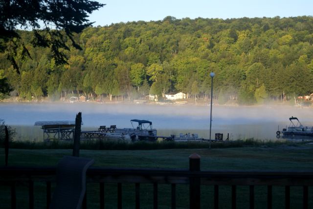 | After arriving for the weekend, a fire was lit and a sunset enjoyed. | The lake steamed every morning. It will hit the 60s F sometime next week. | |||||||||||||||||||||||||||||