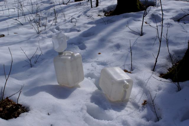 | Most of the trees had produced less than a gallon, but some had dripped well over 2 gallons of sap. Carrying 2 five gallon jugs (about 50 pounds each) back to the ATV got old fast and the one jug at a time method was quickly employed. | ||||||||||||||||||||||||||||||||||||||||||||||||||