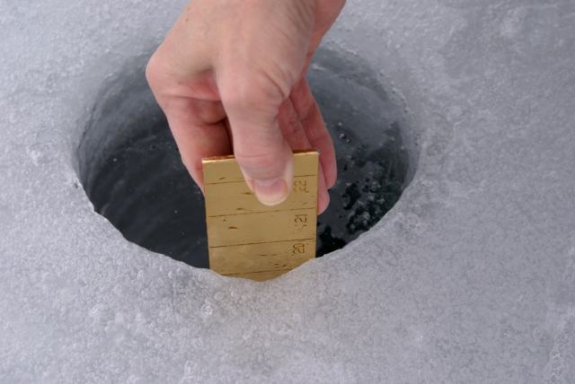| Checking the ice thickness was not an easy task. There was no snow on the surface and it was really, really slippery. | ||||||||||||||||||||||||||||||||||||||||||||||||||